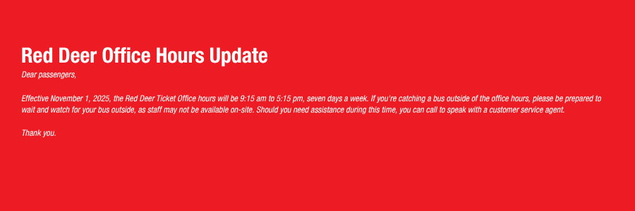 We strive to give everyone a pleasant, lavish trip on the road, however, sometimes unexpected things happen. Before you leave home for your trip, be sure to have a look at our Travel Notices page to keep yourself informed of road conditions, weather, or other service updates. For more information on items like luggage and what to expect when you travel with us, visit our Before You Go page.