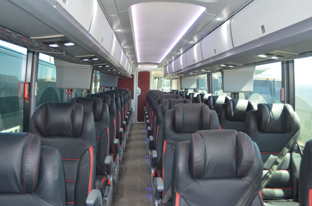 The Red Arrow Difference is mainly rooted in our ongoing goals to offer you the best in inter-city bus transportation. Safety and comfort are our top priorities. And with innovative safety features integrated into the coaches as well as standard safety like seatbelts at every seat, we believe we continue to achieve this goal. As for comfort, we have plush leather seating, and our single-row seating available for privacy and comfort. Onboard we offer complimentary snacks and beverages, and the ability to work easily at your seat with charging ports and fold down tray tables at every seat.